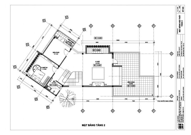 Tầng 2 là không gian phòng thờ và một phòng ngủ, sân phơi và sân cảnh được bố trí ăn theo không gian của tầng 1. Cầu thang chéo theo hình dáng đất, lấy ánh sáng qua vách kính sang vườn sau, tiểu cảnh dưới gầm thang sẽ là một điểm nhấn quan trọng cho không gian bên trong nhà.