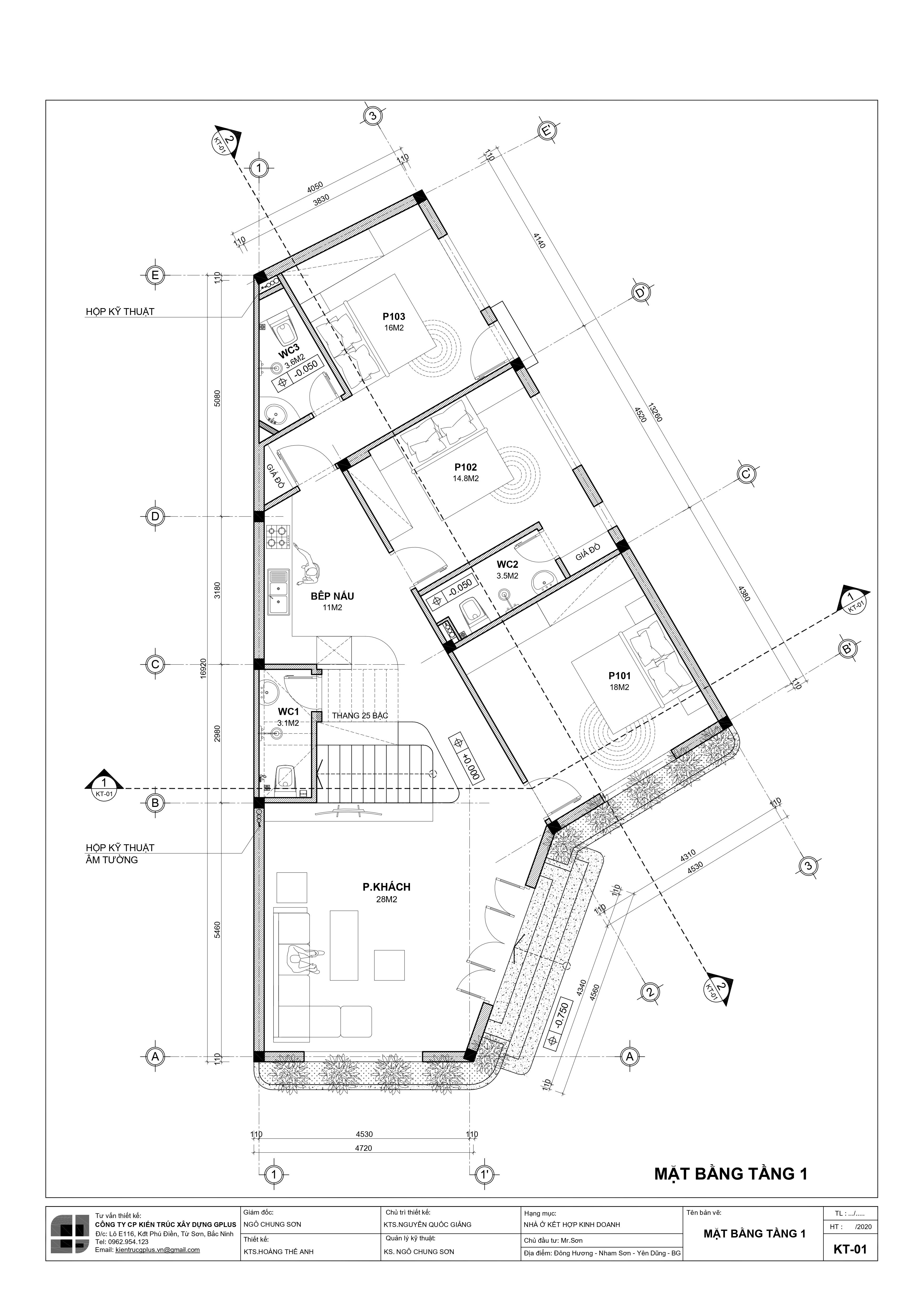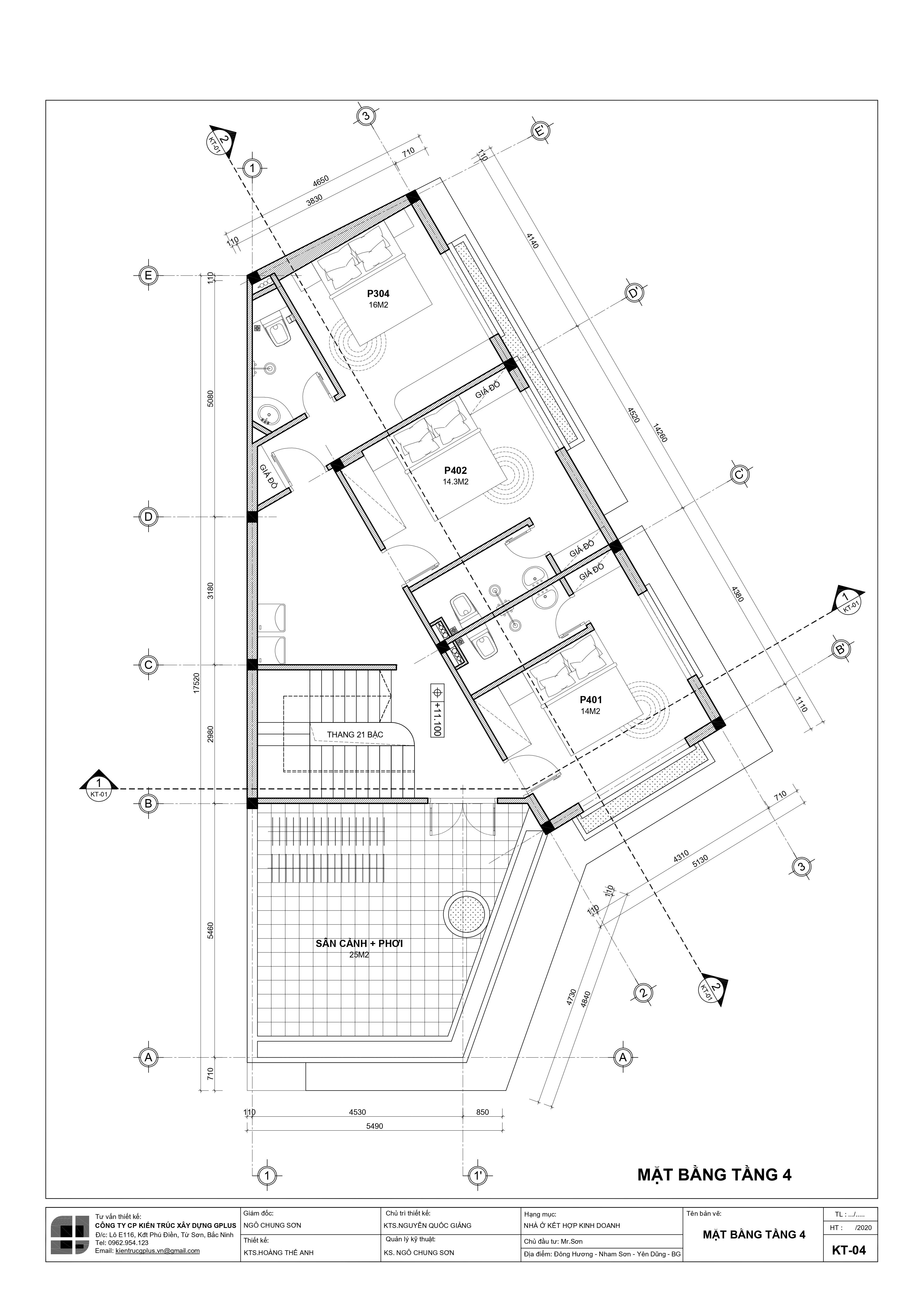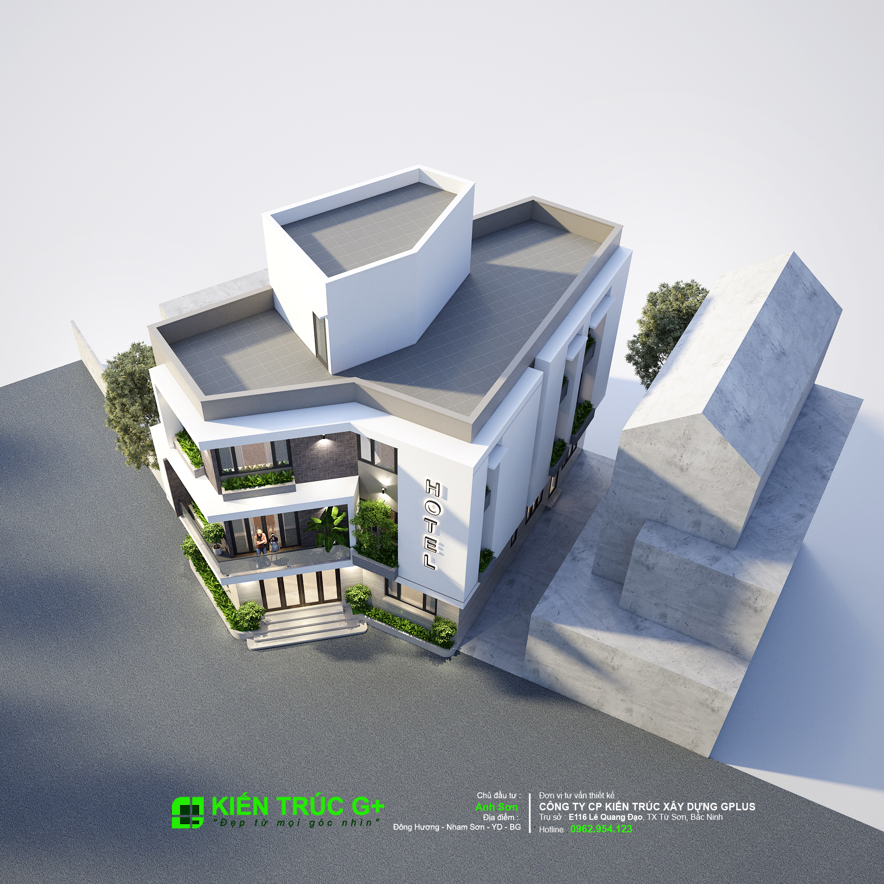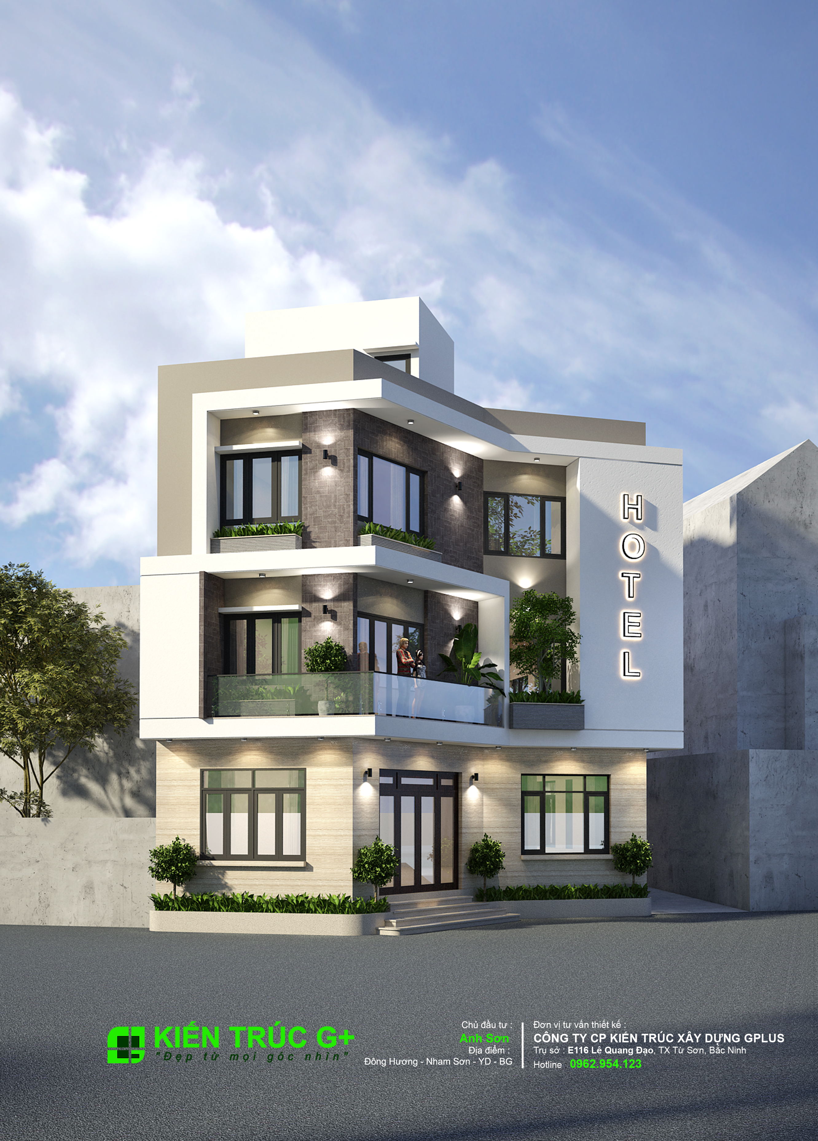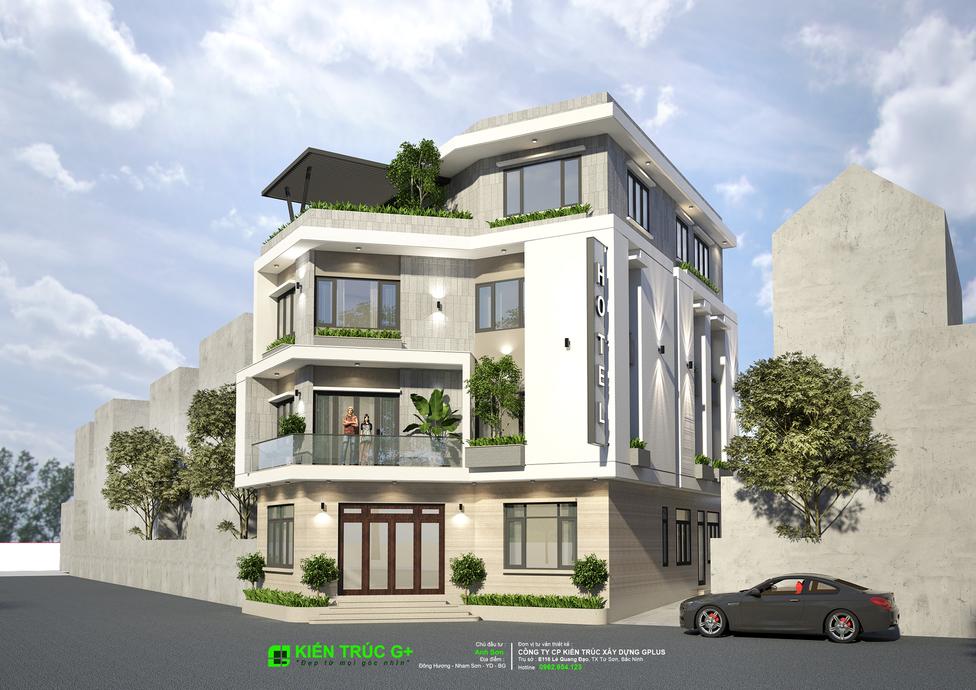Trong phong cách hiện đại, kiến trúc khách sạn nổi lên với những sự phóng khoáng, đơn giản trong đường nét, bố cục. Thậm chí nhiều thiết kế còn không đặt nặng quá nhiều về vấn đề đối xứng. Điều này có thể mang đến cho du khách lưu trú tại khách sạn sự thoải mái, thư giãn nhất. Tuy diện tích không được vuông vắn nhưng với công trình nhà anh Sơn ở Đông Hương – Nhan Sơn – Yên Dũng – Bắc Giang thì đây không còn là trở ngại đối với các kiến trúc sư của Kiến trúc G+.