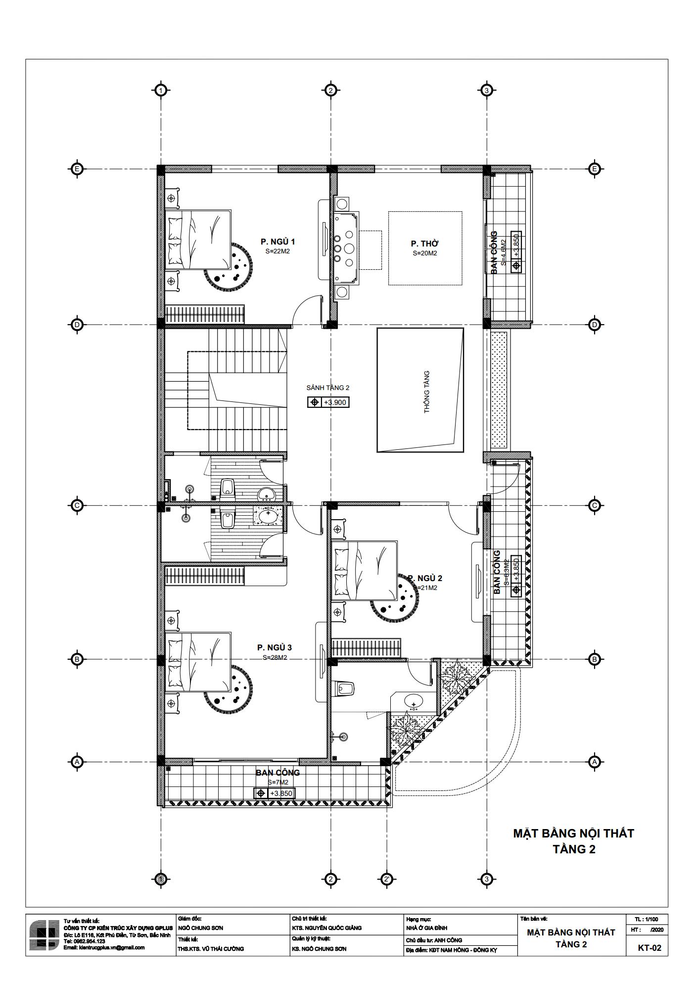 – Tầng 2 : Là không gian của 03 Phòng Ngủ và Phòng Thờ, không gian tầng 1 và 2 được liên kết với nhau qua một không gian thông tầng, từ không gian Phòng Thờ phía trên tầng 2 có thể nhìn qua thông tầng xuống Phòng Khách ở Tầng 1. Phòng ngủ Master rộng 28m2 với khoảng ban công rộng phía trước, WC khép kín rộng 6.2m2 đầy đủ tiện nghi, Phòng ngủ thứ 2 cũng là một phòng khá đẹp rộng 21m2 với ban công và vệ sinh khép kín rộng và đầy đủ ánh sáng, một WC chung cho tầng được bố trí cạnh thang bộ cũng là WC dùng cho phòng ngủ thứ 3.