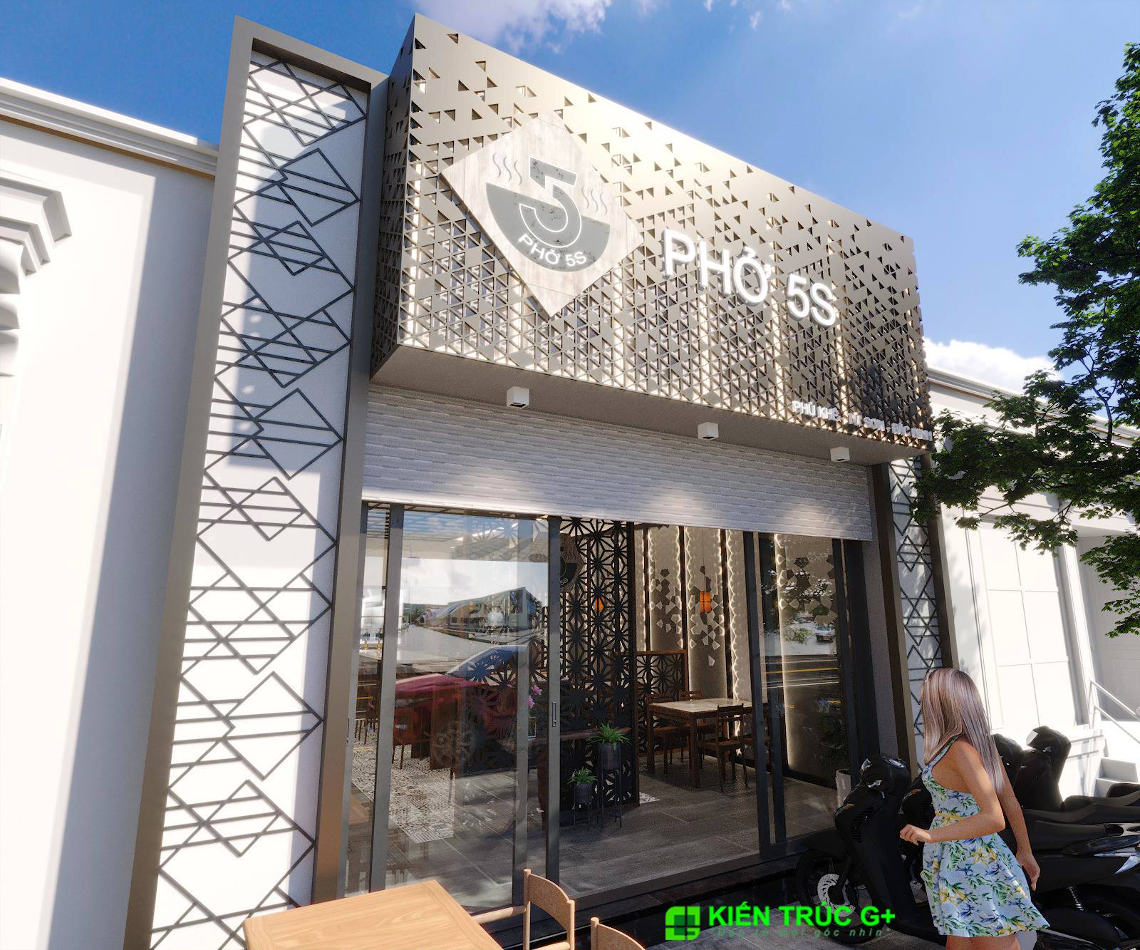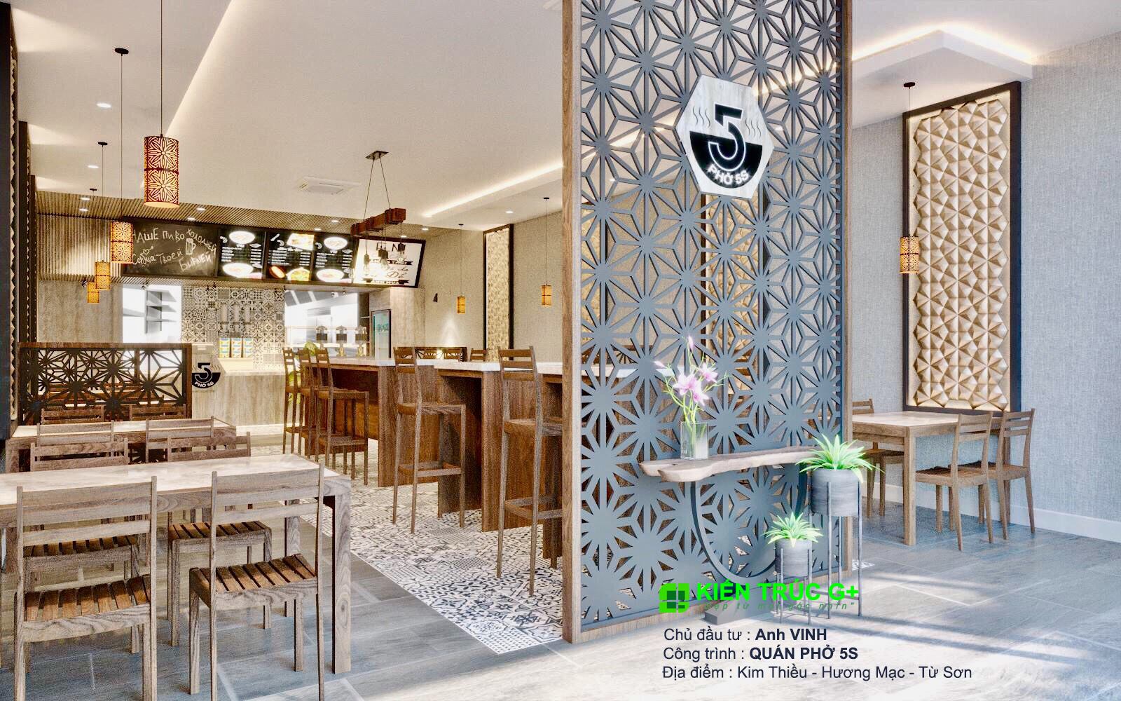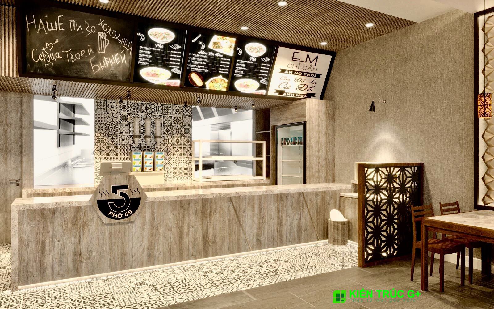Thiết kế quán là một yếu tố quan trọng khi kinh doanh hàng Phở. Đầu tư vào thiết kế quán cũng quan trọng như việc tạo ra một tô Phở chất lượng. Quán phở 5S có không gian sạch sẽ, tiện nghi, tông màu phù hợp với món ăn sẽ tạo cho khách hàng cảm giác thoải mái và kích thích sự thèm ăn của họ. Nội thất cũng quan trọng không kém khi muốn thiết kế một quán Phở đẹp và thu hút.Vừa tạo không gian ấm cúng và phù hợp với tông màu quán, Các kiến trúc sư đã lựa chọn loại bàn ghế, kệ tủ cao cấp, chất liệu tốt vừa góp phần nâng giá trị quán mà còn giảm thiểu rủi ro hỏng móc phải thay thế và sửa chữa. Thiết kế quán có 3 dãy bàn vừa tạo không gian rộng rãi trong quán cho khách hàng không cảm thấy ngột ngạt vừa thuận tiện cho phục vụ đi lại