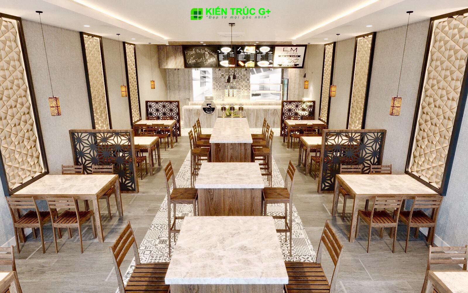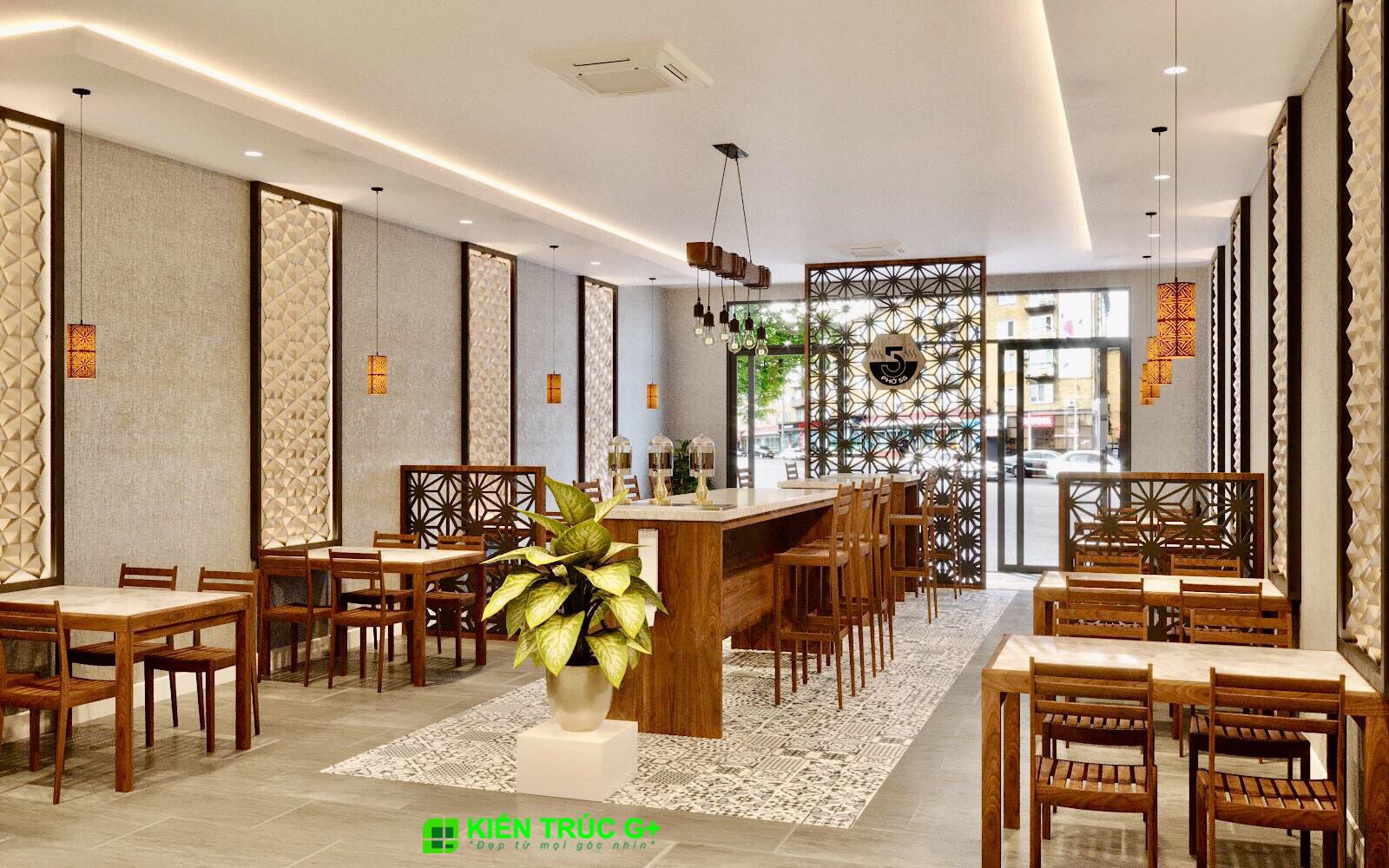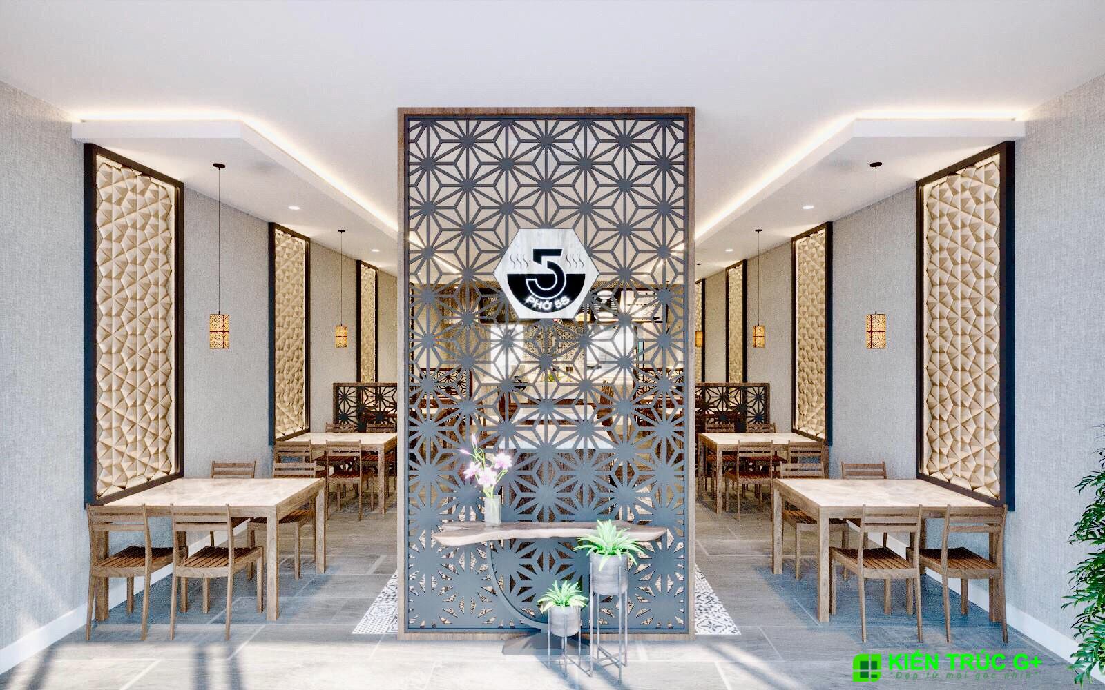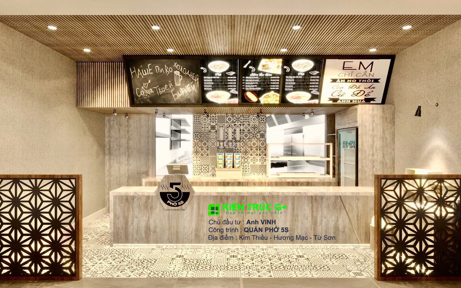 Thiết kế quán là một yếu tố quan trọng khi kinh doanh hàng Phở. Đầu tư vào thiết kế quán cũng quan trọng như việc tạo ra một tô Phở chất lượng. Quán phở 5S có không gian sạch sẽ, tiện nghi, tông màu phù hợp với món ăn sẽ tạo cho khách hàng cảm giác thoải mái và kích thích sự thèm ăn của họ. Nội thất cũng quan trọng không kém khi muốn thiết kế một quán Phở đẹp và thu hút.Vừa tạo không gian ấm cúng và phù hợp với tông màu quán, Các kiến trúc sư đã lựa chọn loại bàn ghế, kệ tủ cao cấp, chất liệu tốt vừa góp phần nâng giá trị quán mà còn giảm thiểu rủi ro hỏng móc phải thay thế và sửa chữa. Thiết kế quán có 3 dãy bàn vừa tạo không gian rộng rãi trong quán cho khách hàng không cảm thấy ngột ngạt vừa thuận tiện cho phục vụ đi lại